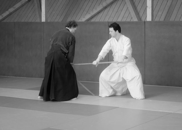 b) A la bonne distance, Shi tient le Jo verticalement, Uchi face à lui fait passer le Tachi de la main gauche à la main droite.